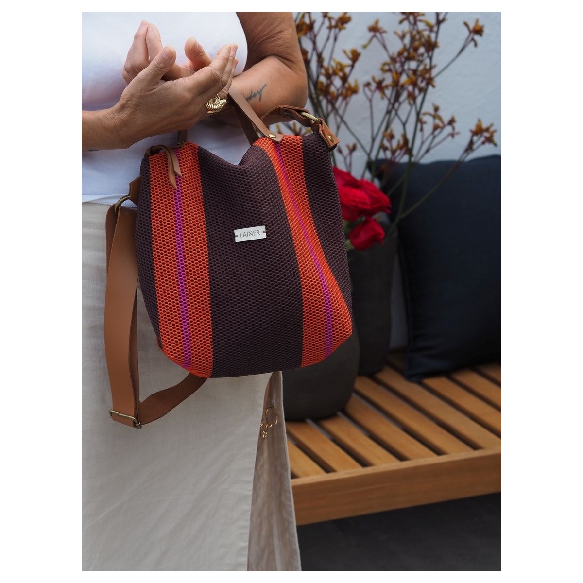 Inspirado en la energía vibrante de la playa Zurriola, este modelo está confeccionado en tejido 3D de alta calidad, resistente y de fácil cuidado. Su estampado exclusivo ha sido diseñado especialmente por y para LAINER, lo que convierte a cada bolso en una pieza única. Las asas versátiles de mano y bandolera te permite llevarlo al hombro, cruzado o en la mano, adaptándose a cada ocasión. En el interior, cuenta con un bolsillo cerrado con cremallera para guardar lo esencial de forma segura. El cierre principal incorpora una tira de cuero para facilitar la apertura y el cierre, y su material es lavable, pensado para acompañarte siempre impecable.